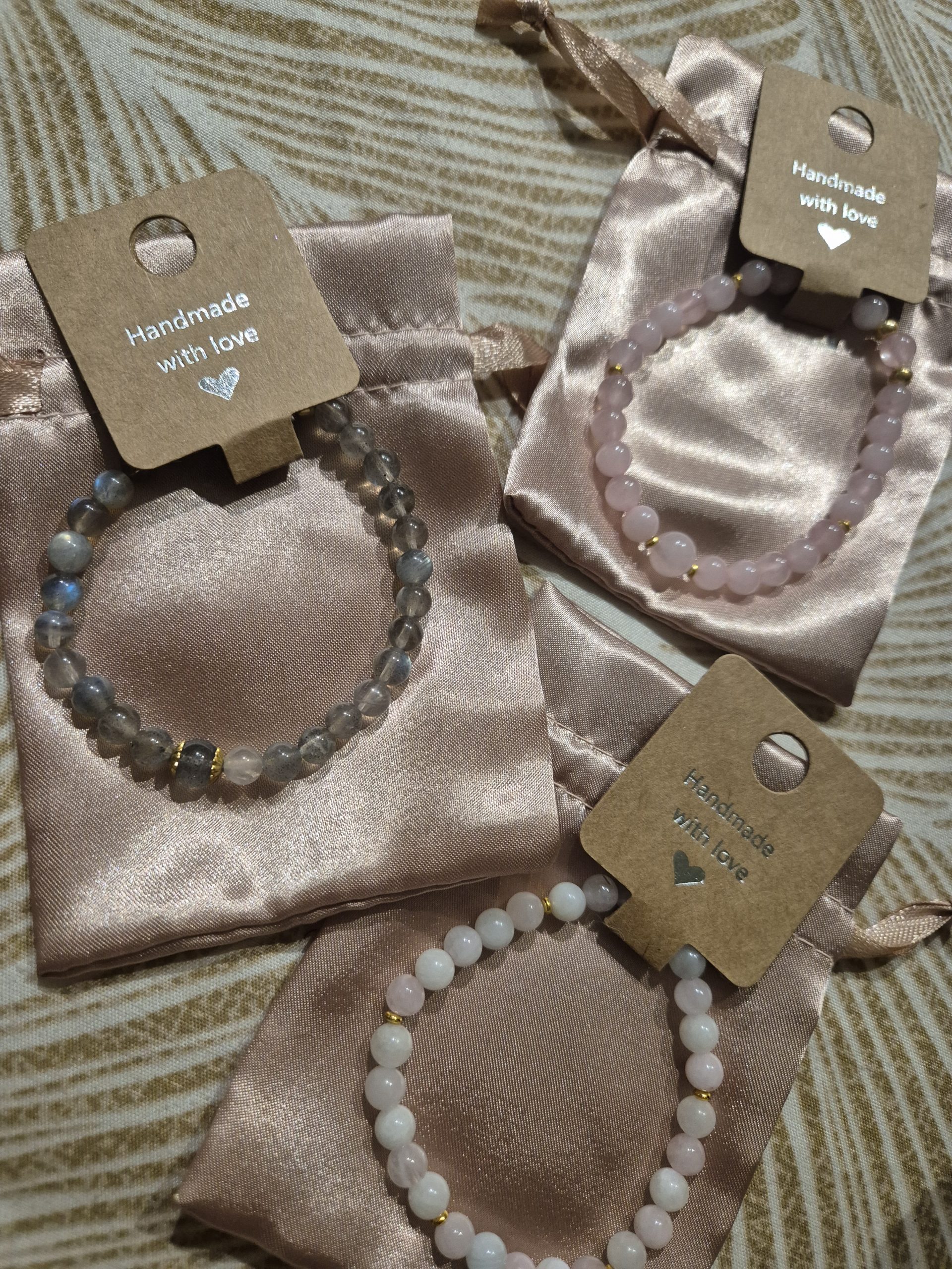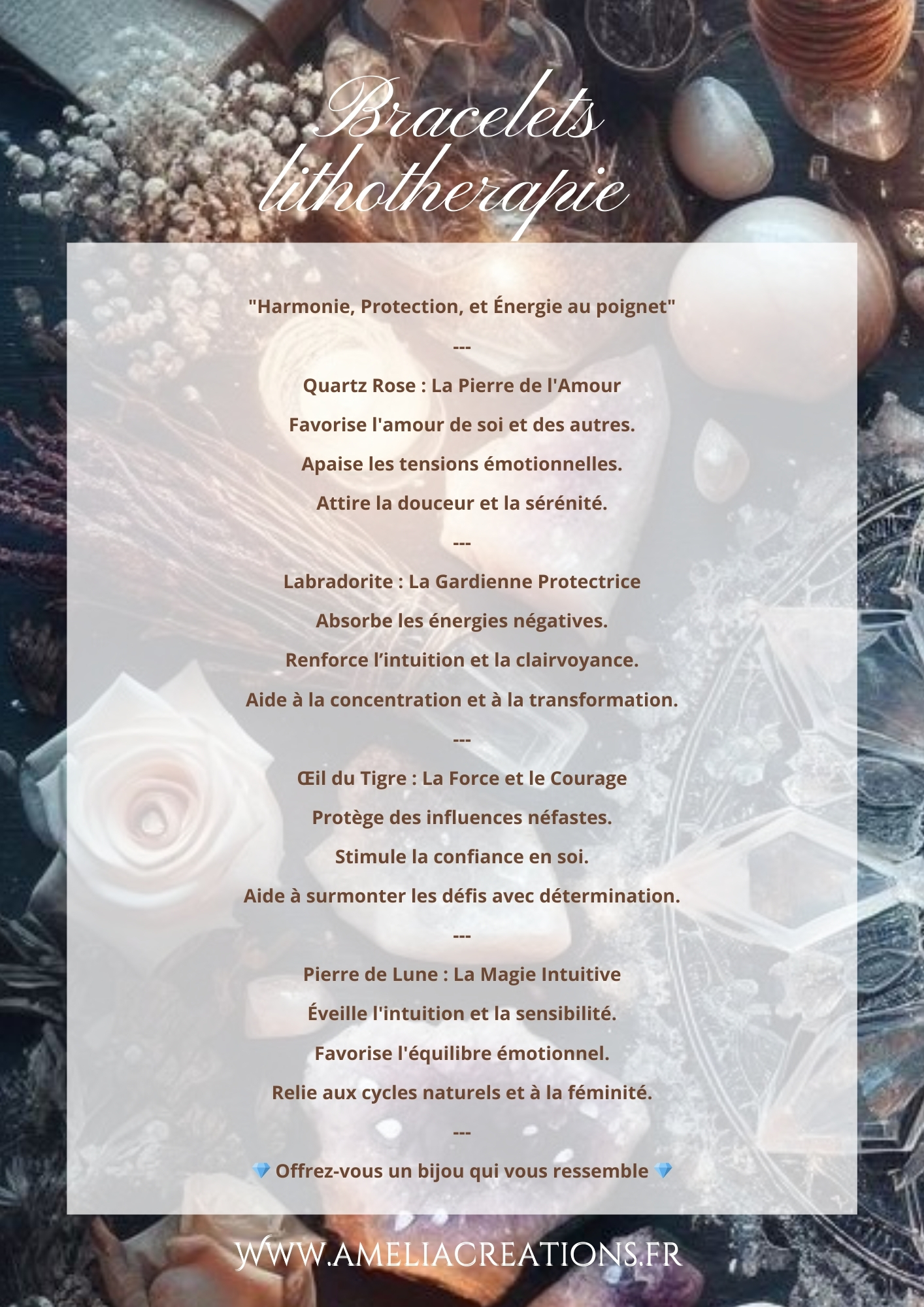 | Pierres naturelles | Quartz rose, Labradorite, Oeil du tigre, Pierre de lune |