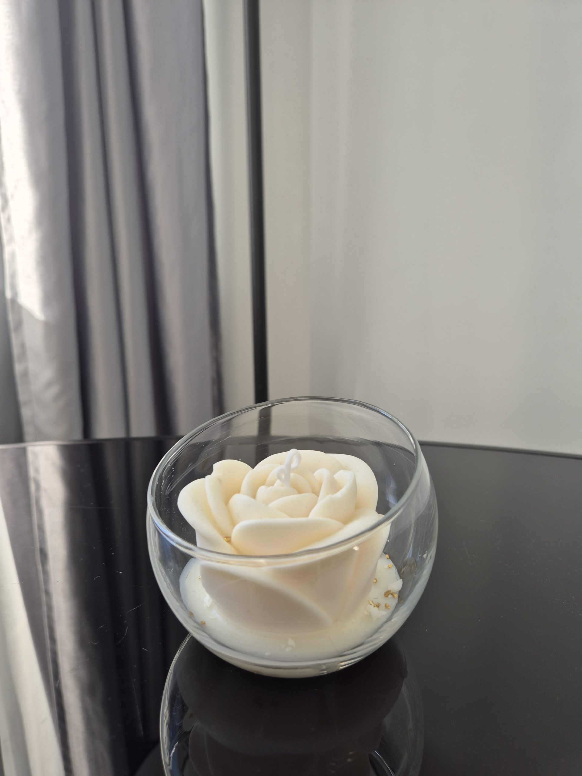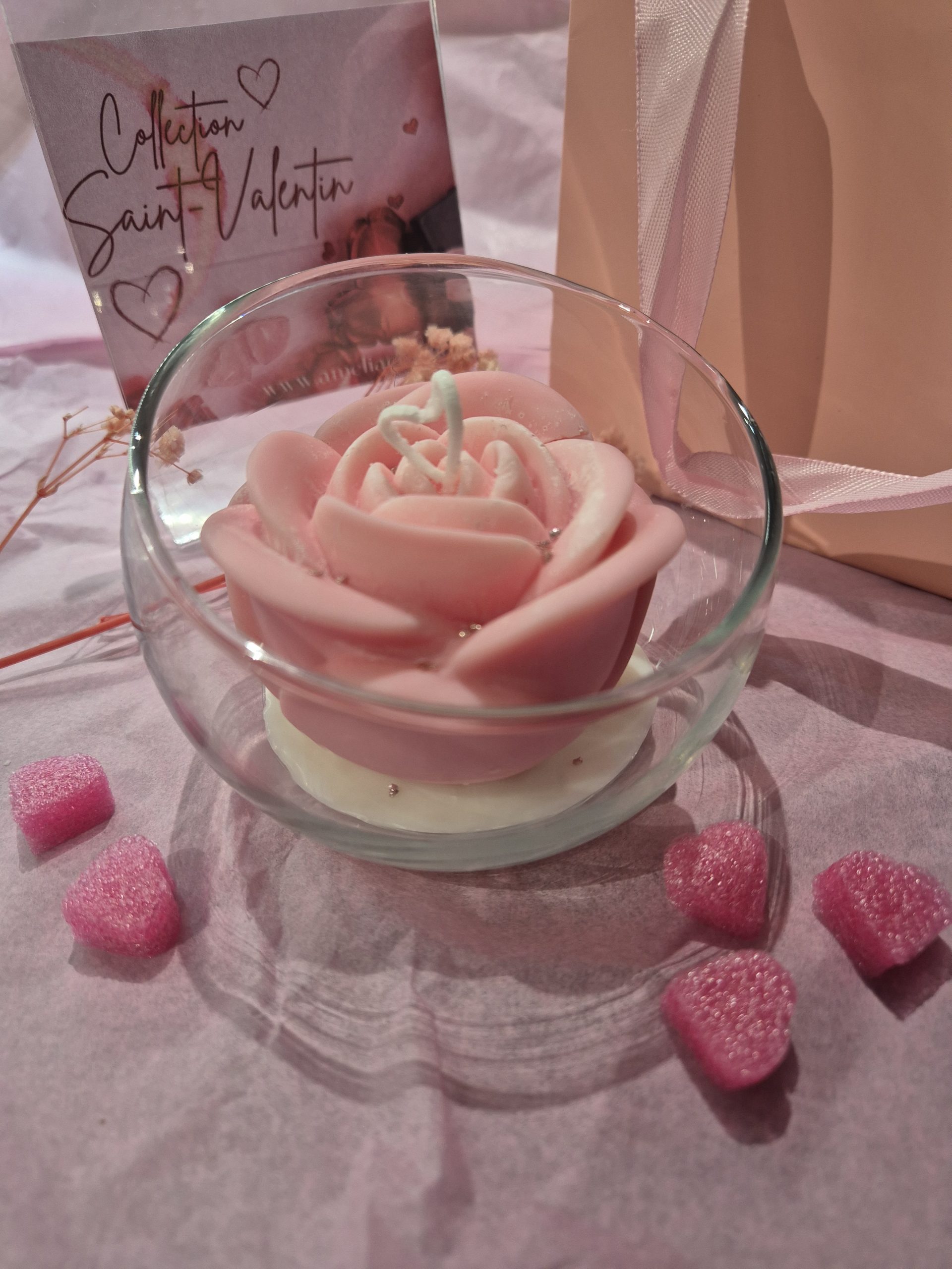 Sculptée en forme de rose en cire, elle incarne la délicatesse et la passion d’un moment partagé.