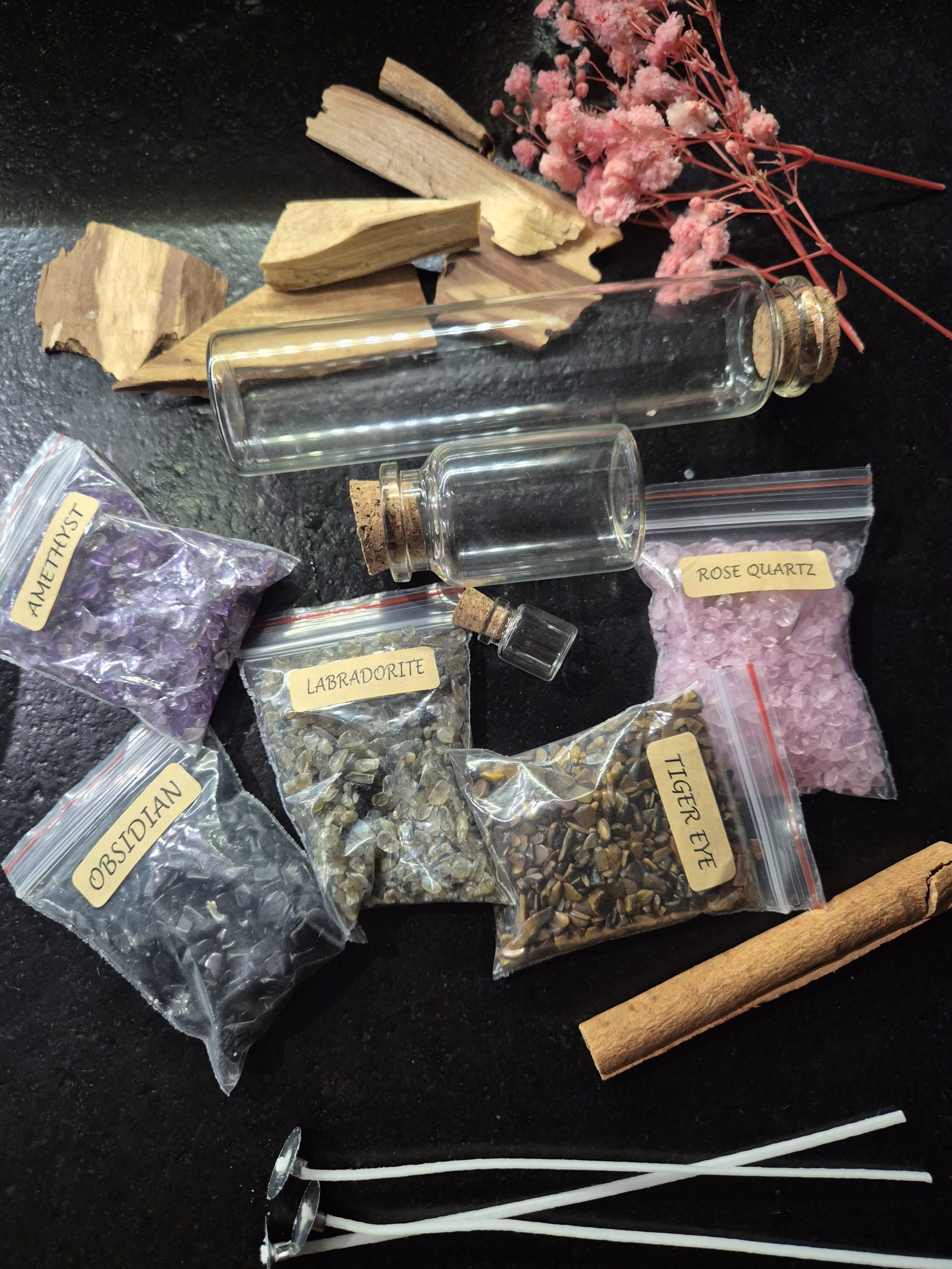Enfin, couronnant le tout, une fiole remplie de fragments de pierres est délicatement posée sur chaque bougie, ajoutant une touche d’élégance et augmentant les bienfaits de ces bougies de lithothérapie dont vous pourrez en préserver toute la magie.